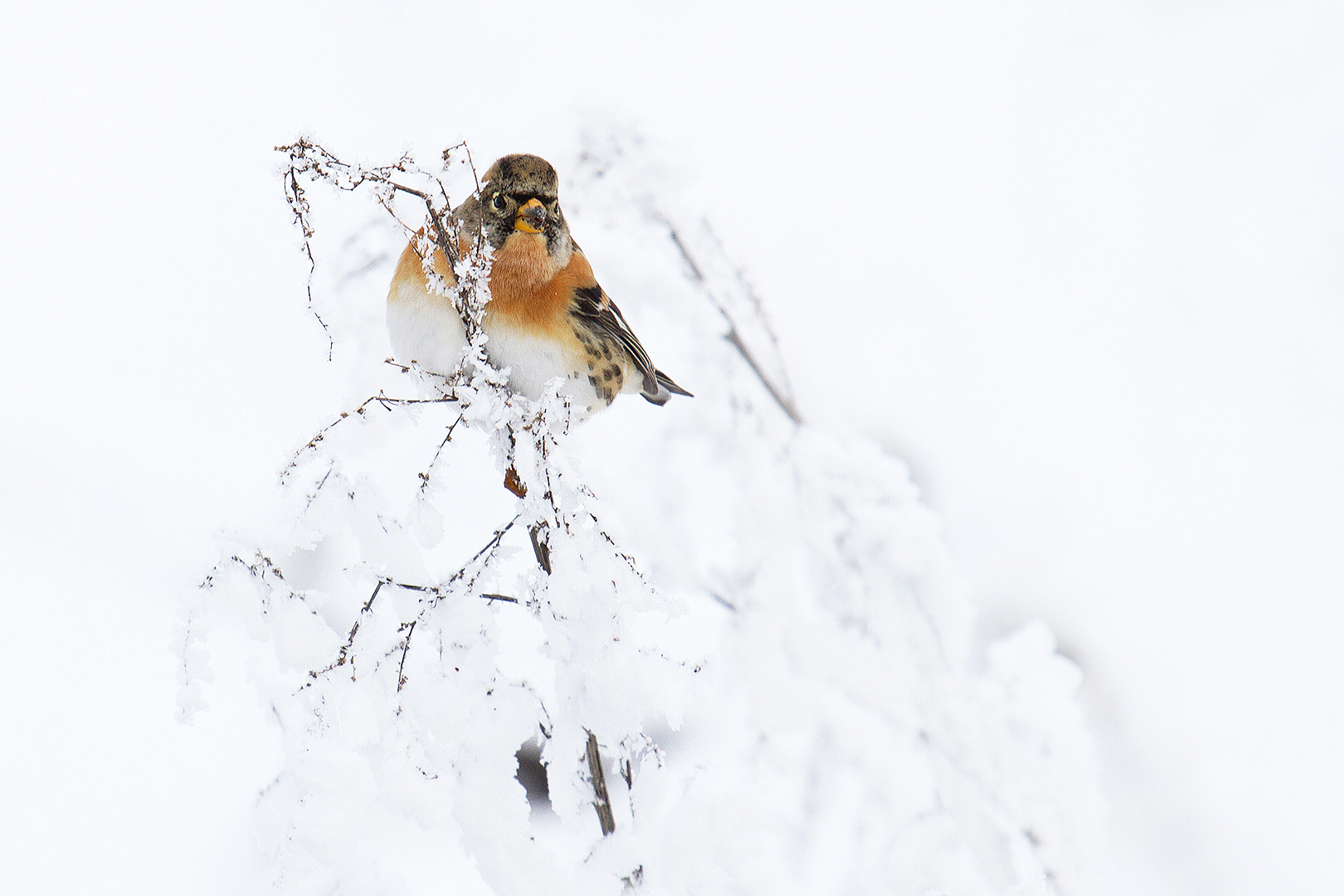 Wat is zo'n witte wereld toch mooi en wat is dat winterlicht toch fijn. Knap belichte foto, ondanks al dat wit tekent de sneeuw zich toch goed af tegen de achtergrond. Zo'n prachtige soort als de Keep met zijn warme kleuren is natuurlijk de kers op de taart.