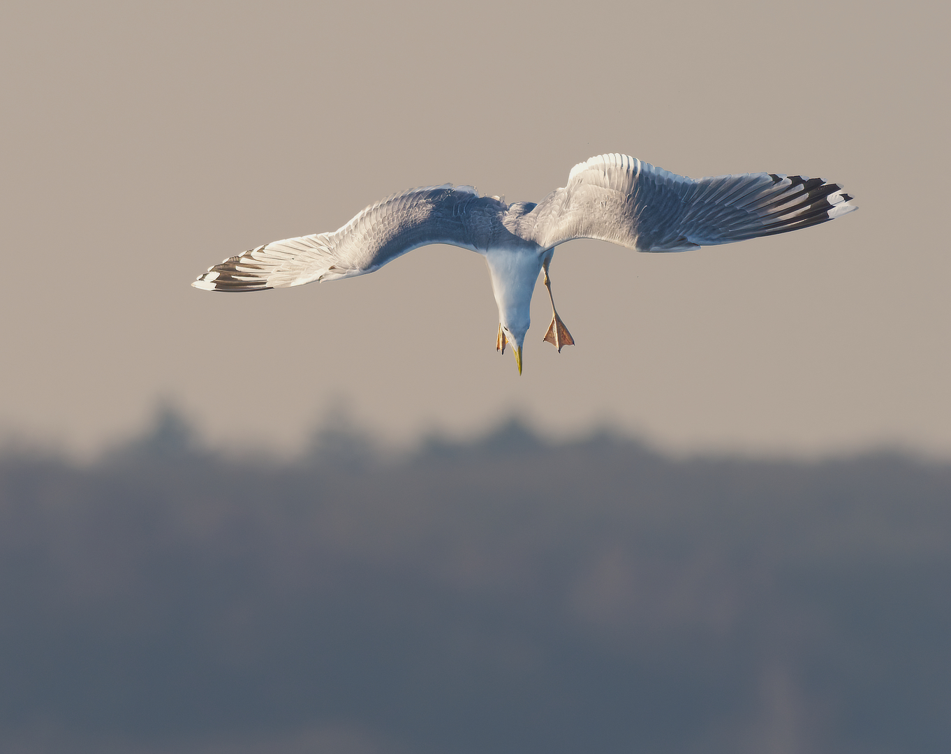 De meeuw kwam aanvliegen en draaide zichzelf plotseling in een duik naar beneden. Hij ging kopje onder en kwam boven met iets wat op een dode eend leek. Helaas geen duidelijk foto daarvan. Dit is het moment dat hij net de duik in zet.