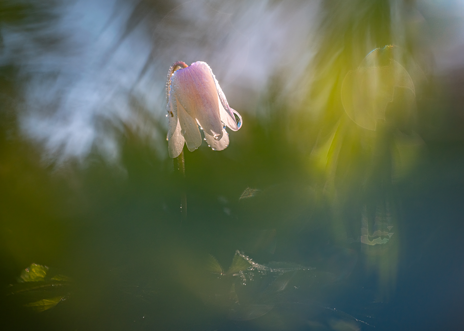 Heerlijk Loes...het voorjaar we kunnen weer helemaal los. Prachtige opname zo met de druppeltjes op het fragiele Bosanemoontje, volgens mij door het groen gefotografeerd, fraaie vervaging van het groen, het bloemetje steekt er fier bovenuit en staat op een mooie plek in je compositie. Heb je het gefotografeerd met een handmatig lensje?? je diafragma staat op f 1.0 en dat word bij mij altijd aangegeven als het een handmatig lensje betreft?