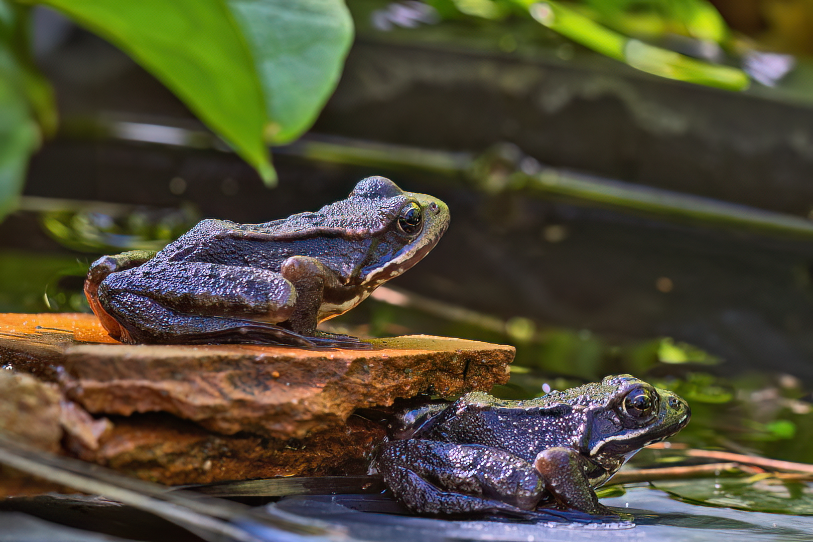De bruine kikkers genieten van het zonnebaden in mijn mini vijvertje.