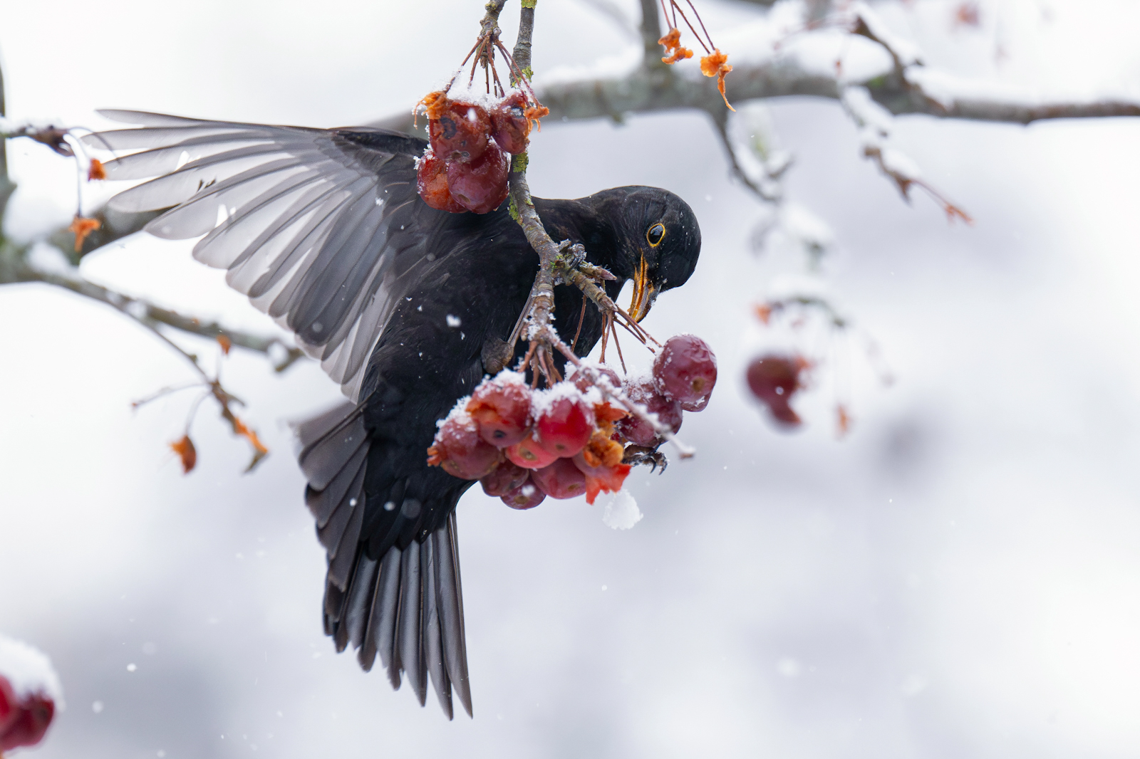 In de tuin doet deze merel zich tegoed aan het uitgesteld voedsel wat pas in de winter zachter wordt en daardoor beter eetbaar. Door de sneeuw wordt het contrast tussen de merel en het sneeuw extra benadrukt.
