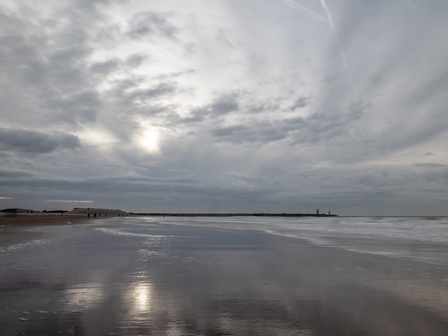 En plots kwam er wat licht door het wolkendek. Een mooie gelegenheid om een plaatje te schieten van een reflectie in het natte zand.