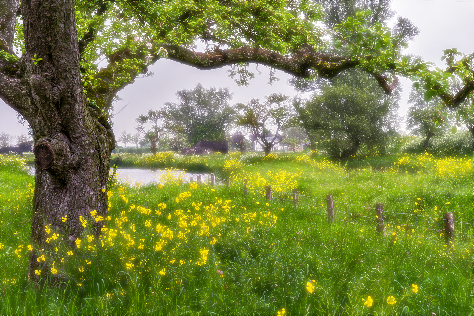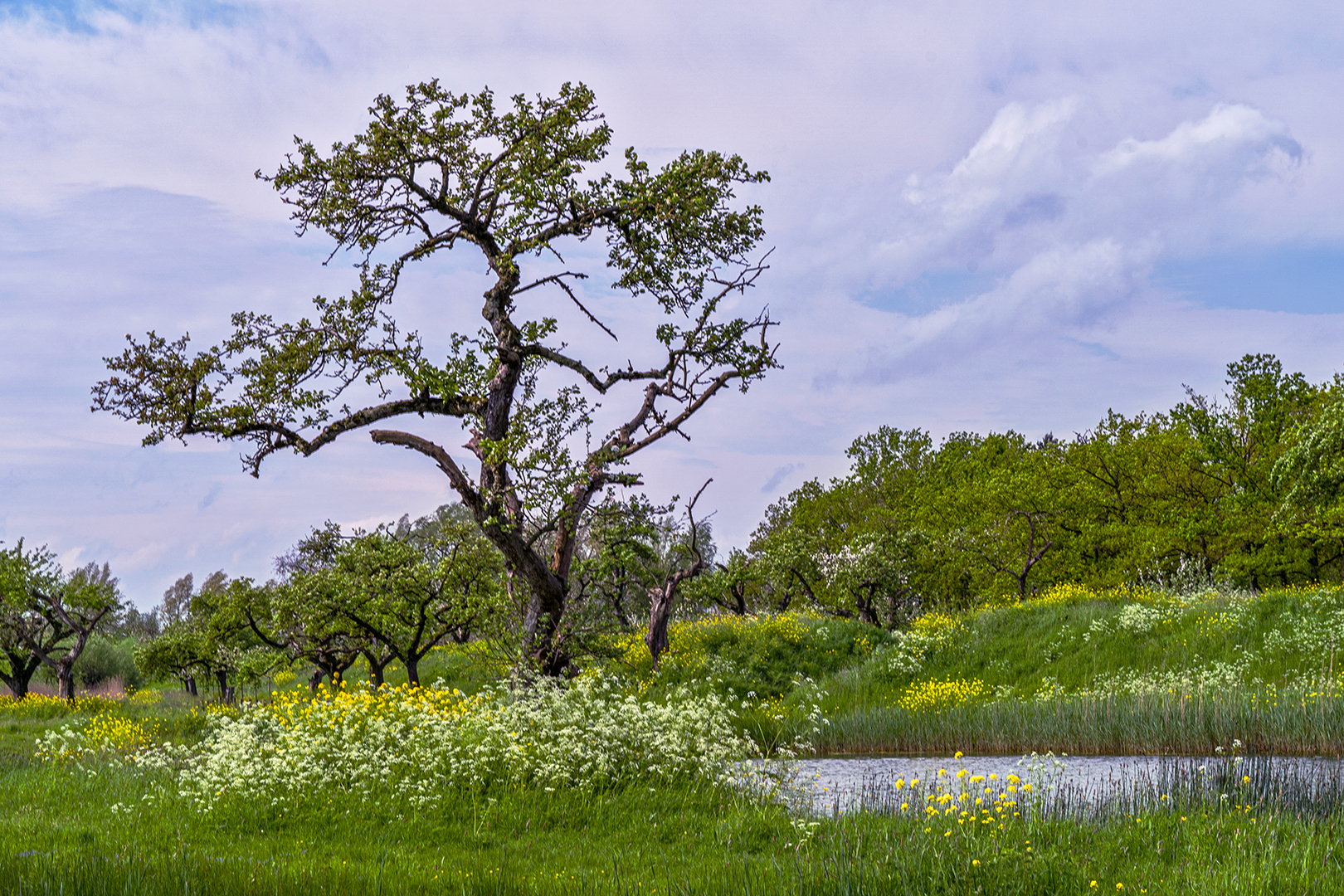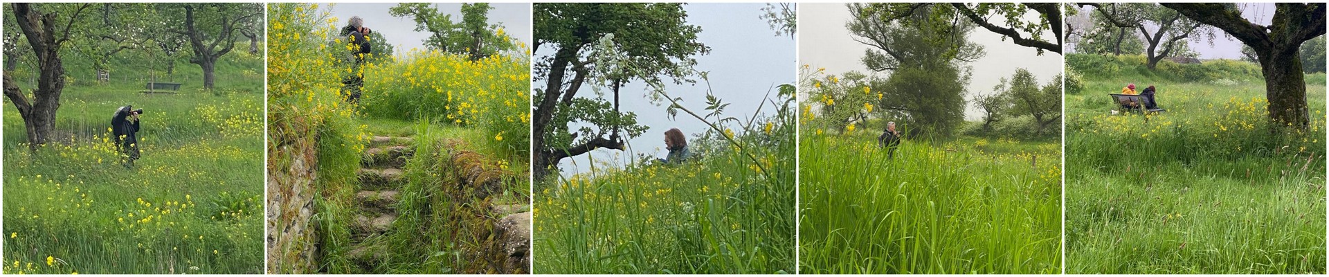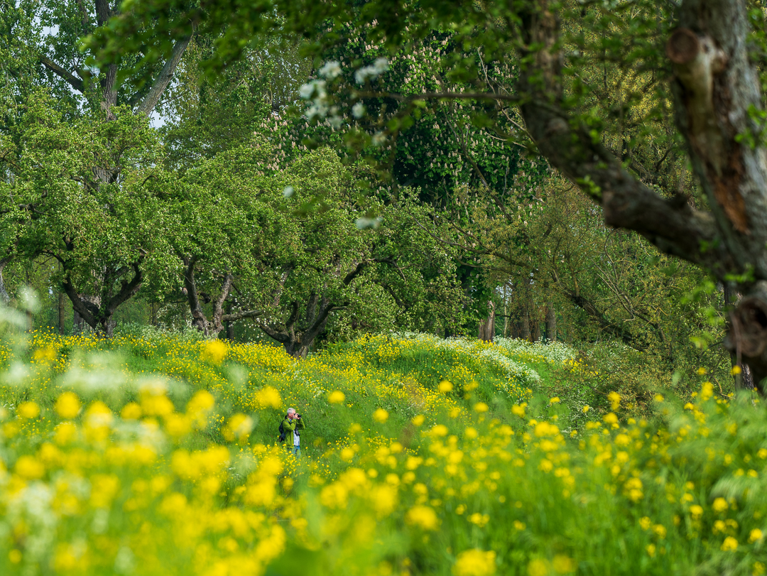 Helaas zat het weer aanvankelijk niet mee. Het had ‘s nachts nog behoorlijk hard geregend. De dag begon dan ook grijs. Gelukkig brak rond 10 uur de lucht wat open en werden de kleuren van het gras, fruitbomen, koolzaad en fluitenkruid wat fleuriger en aansprekender. Door de wind was macro fotograferen helaas vrijwel niet mogelijk. Ook de vlinders zaten door de regen lekker verstopt. Maar iedereen vond het landschap en het gebied heerlijk rustig om te genieten en te fotograferen.