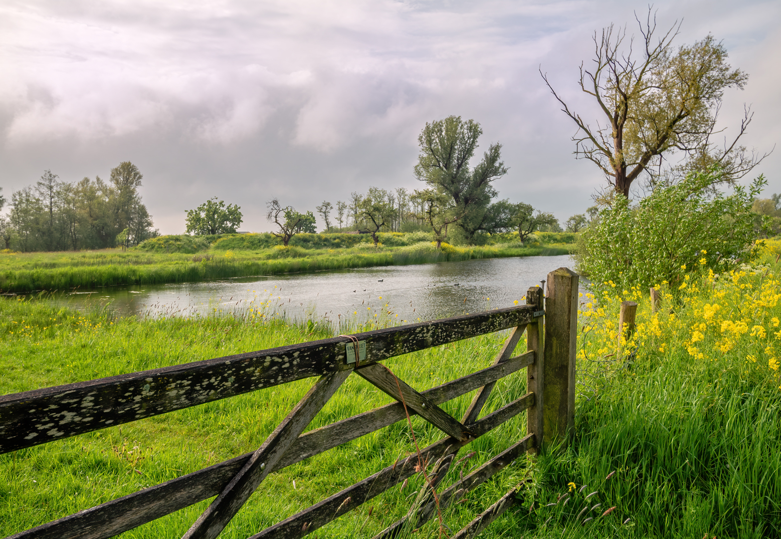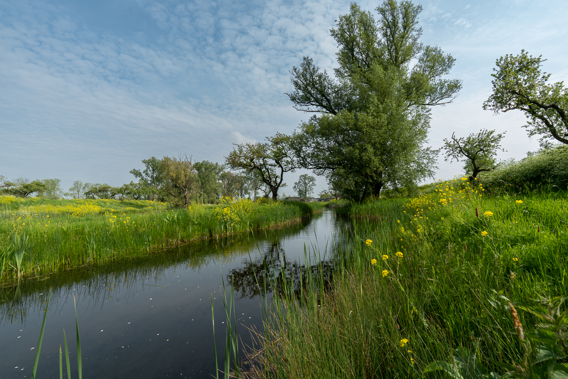 Landschap bij Werk aan de Groeneweg tijdens de fotodag op vrijdag 12 mei. Ik ben langs de waterkant, bijna in de sloot gaan staan om een lijn te creëren. Als ik lieslaarzen had gehad, dan had ik nog een stapje naar links gezet. Nu maar niet gedaan. f11, 1/125, iso320 16mm