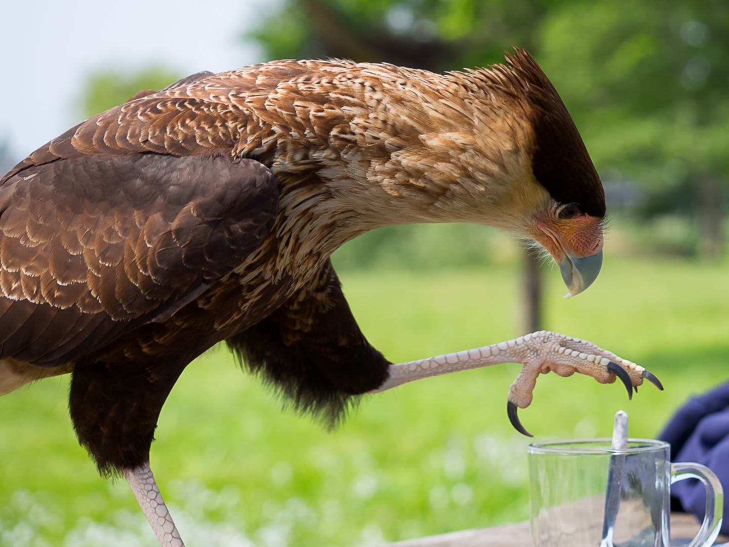 Kuifcaracara - Jan te RietstapJan: Ik heb heel lang nagedacht welke foto ik zou insturen. Die van de landende Oehoe met zijn vleugels prachtig uitgestrekt… , van de Zeearend die over het water scheert… maar nee het is toch deze geworden. Deze Kuifcaracara was zo nieuwsgierig naar het lepeltje in het theekopje. Het moment duurde ook maar een aantal seconden, waarbij ik snel moest reageren om een aantal foto’s te maken.
