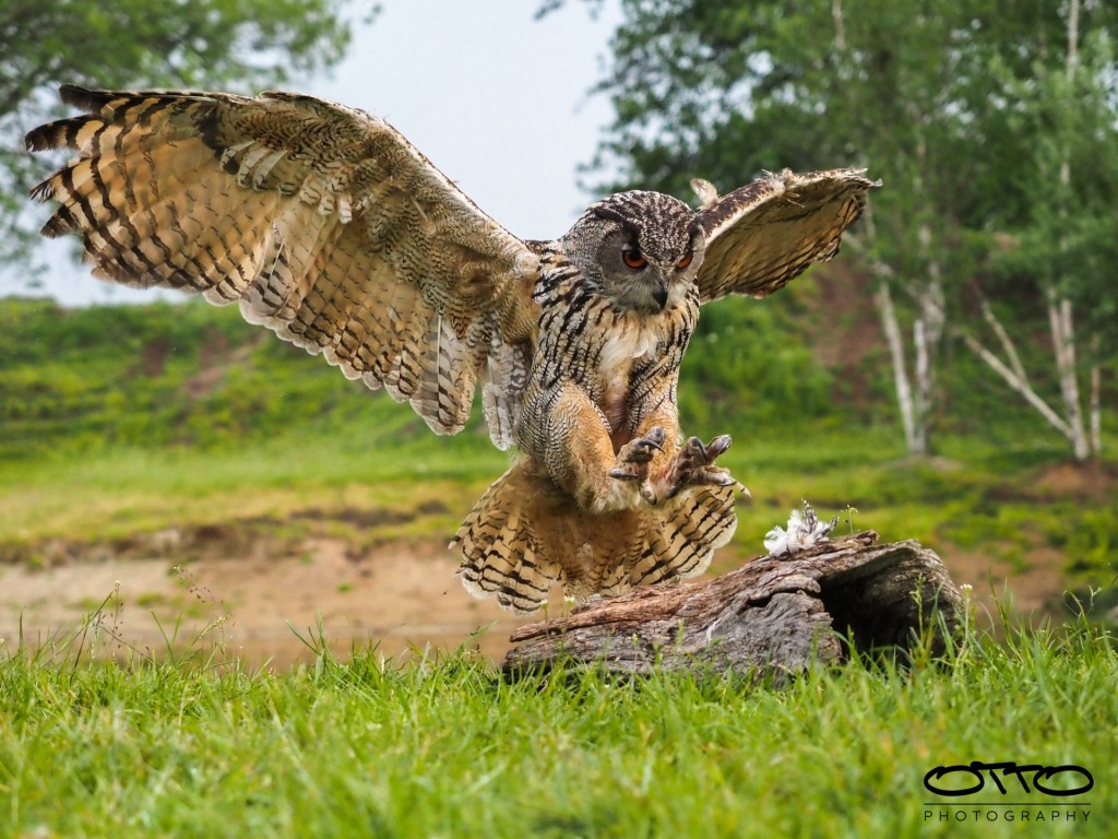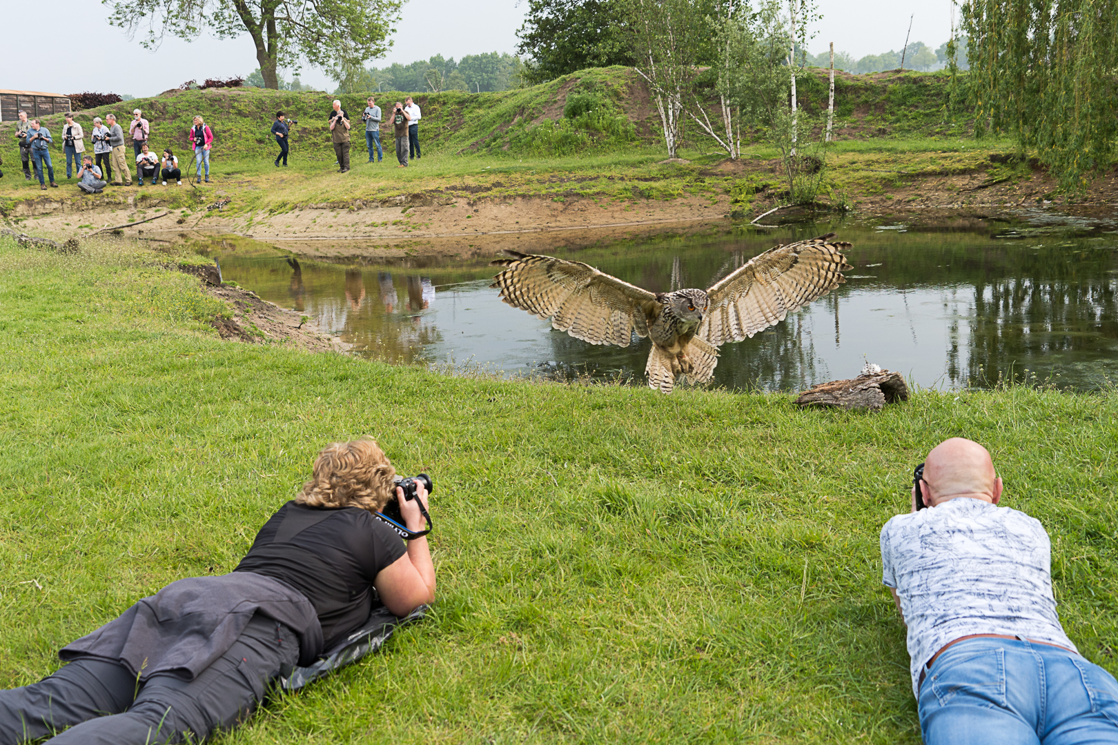 Oehoe - Otto van den BergEr was voldoende ruimte en meerdere mogelijkheden om jouw mooiste plaatje te schieten. Na z’n drie-en half uur en een regenbuitje verder stonden er op mijn SD kaartje van 16G een kleine 950 foto’s, hoe rap kan dat gaan. Thuis aangekomen vertelde ik vol enthousiasme wat ik allemaal had gezien en meegemaakt. Het uitzoeken van alle foto’s kon beginnen en ik had meerdere toppers. Er was een foto op de Facebook Page van Olympus geplaatst waarop ik en Babette plat op het gras liggen te wachten aan de rand van de vijver op de Europese oehoe. De eerste aanvlieg actie ging niet helemaal goed, maar de tweede vlucht was helemaal perfect en ben ik persoonlijk heel tevreden over en is hiermee bestempeld tot mijn favoriet van die dag. Wat heb ik genoten van die middag door de combinatie van mensen, de natuur en het aanhoren / delen van deze passie aan elkaar.