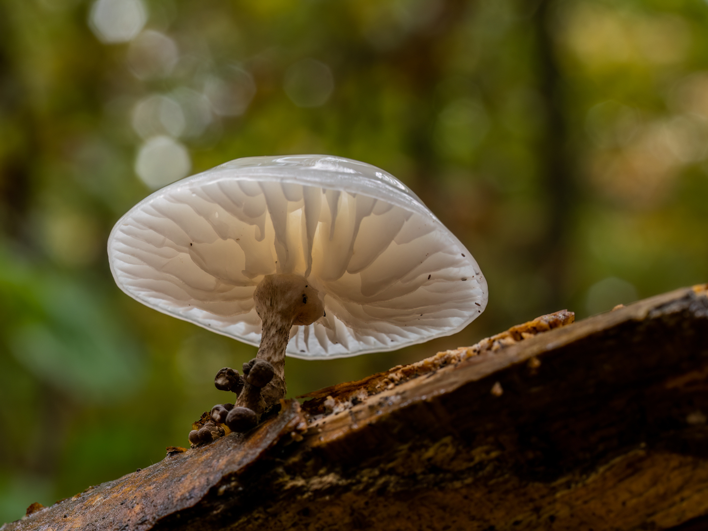 Dit mooie Porseleinzwammetje groeide op een losse grote tak, tak lag op de grond en door een medefotograaf werd ik erop gewezen. De tak een beetje in het midden van het bospad geplaatst om een rustige achtergrond te krijgen. Naar het licht gefotografeerd om de bokehbollen te krijgen. Achter de tak een lampje gelegd welke warm licht uitstraalde. Na de fotosessie de tak weer netjes aan de kant gelegd. Wat was het weer een fijne groep en fijne begeleiding, tips en trucs, elkaar helpen, zo mooi!
