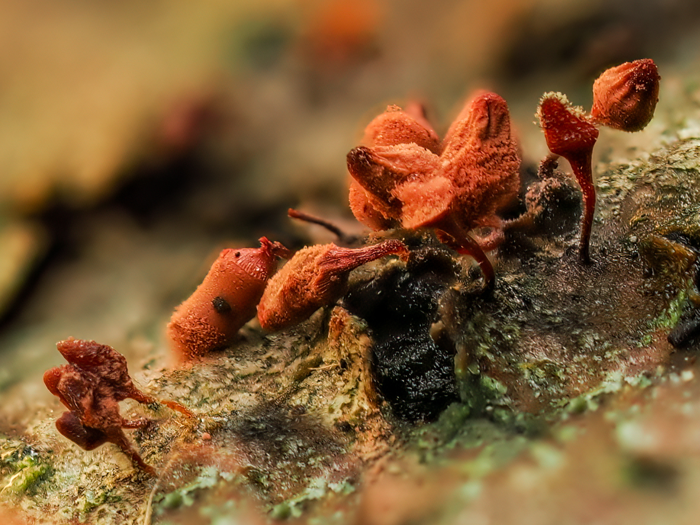Zaterdag 15 oktober met Loes en een groep andere enthousiaste fotografen paddenstoelen gaan fotograferen. Loes wees mij op dit zeer bijzondere paddenstoeltje - met het blote oog nauwelijks te zien, dus plat op de grond, kiepen, keren, kantelen met de camera om een goede compositie te vinden. Ik heb met mijn mobiel een overzichtsfoto gemaakt van de opstelling (statiefje, lampje en vanaf afstand alleen de rode stipjes die je ziet). het geeft een leuk beeld.