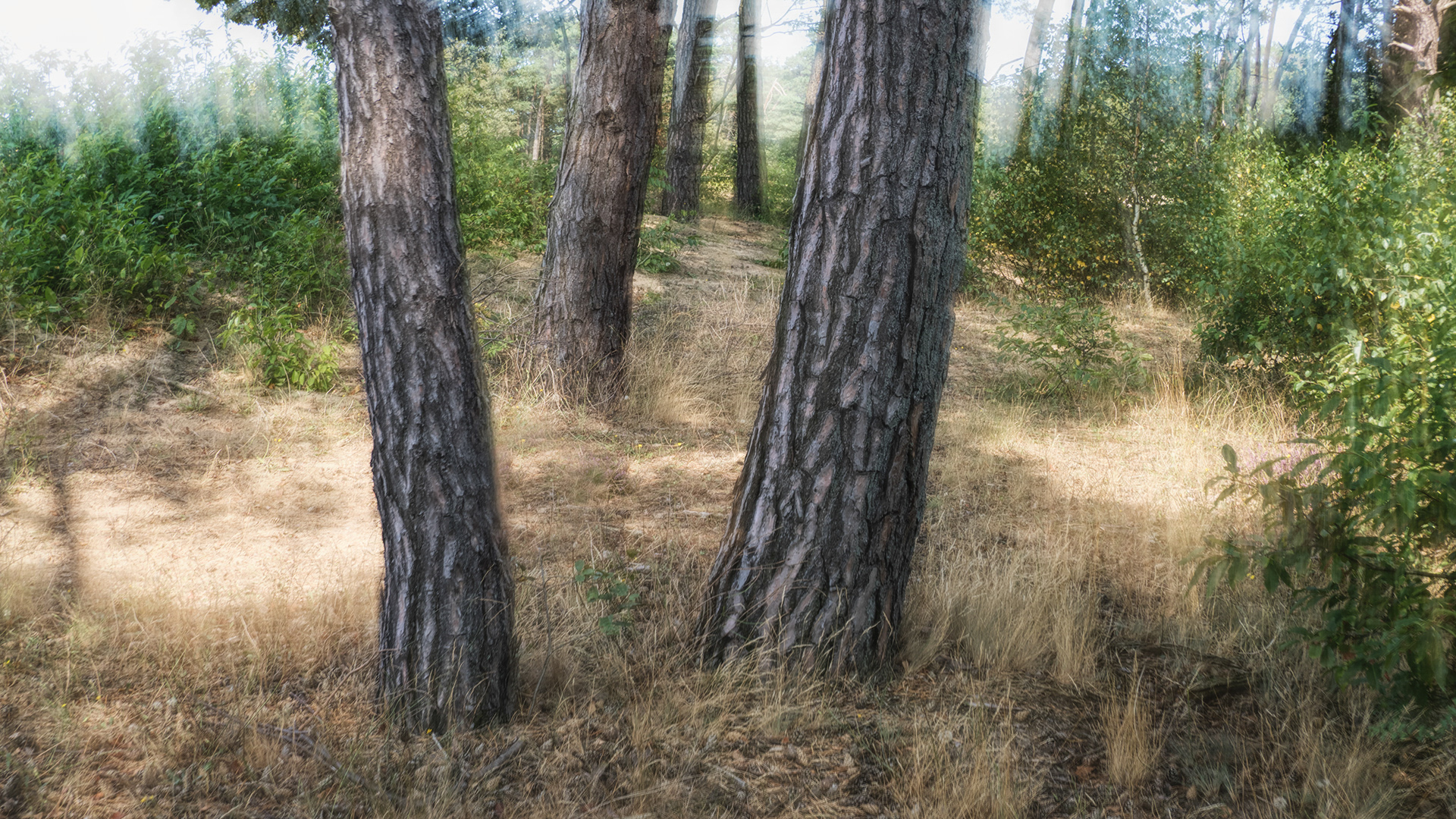 Een gezellige dag gehad met DDN op de Zuiderheide. We werden hartelijk ontvangen door Loes en Brigitte en er was koffie, thee en natuurlijk de overbekende DDN koek. Na een korte wandeling naar de heide, werd een plekje gezocht onder een boom, daarna kon iedereen z'n gang gaan met de camera, er werd regelmatig verkoeling gezocht in de schaduw onder de boom, zo ontstonden leuke gesprekken. Zeer geslaagde dag. Hier heb ik de schaduw van het bos opgezocht en een ICM gemaakt van 3 bomen.
