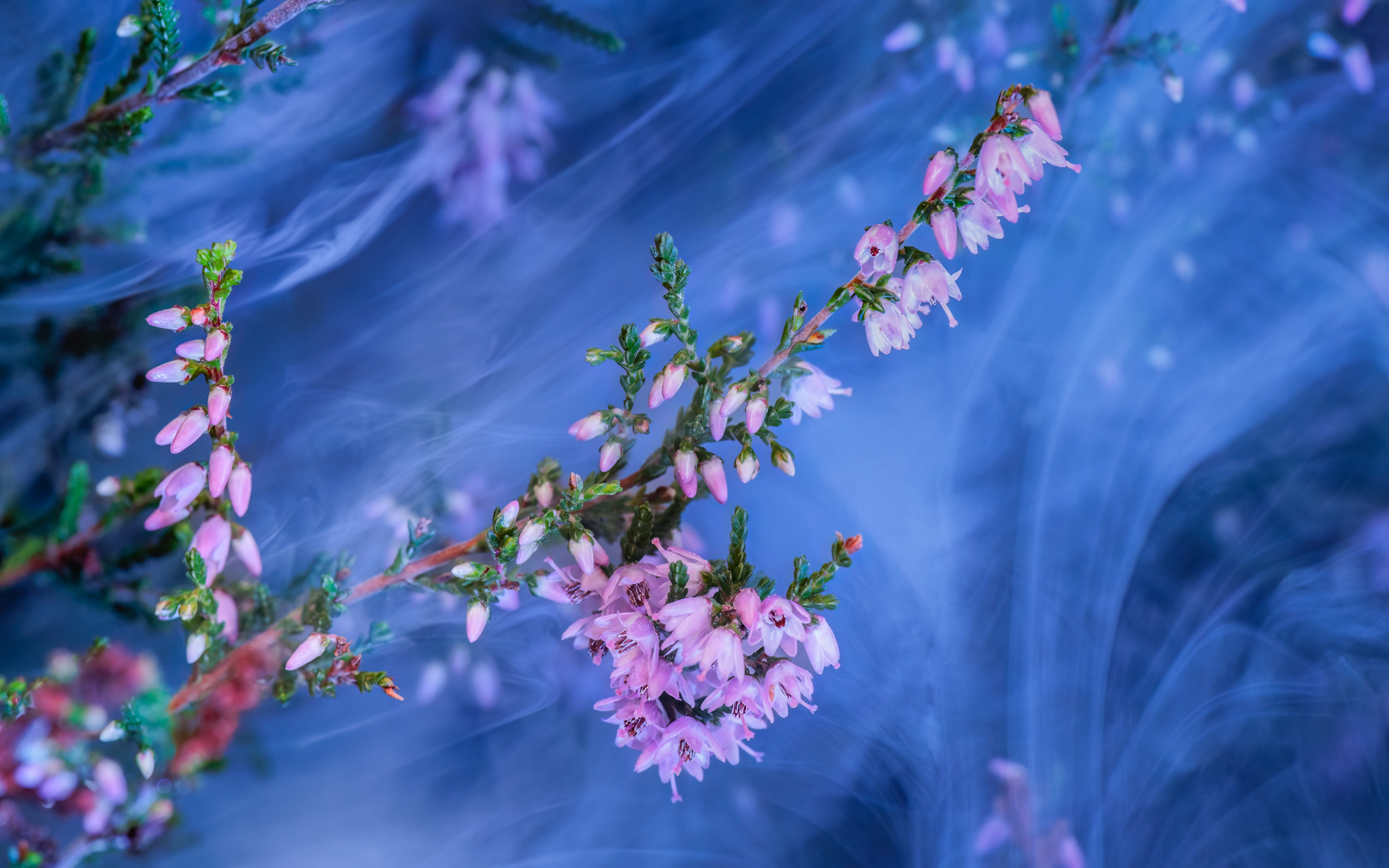 Bij het maken van een macro van de struikheide vond ik al snel dat de foto's erg druk werden. Zeker als je ook nog focus-stacking toepast. Hoewel dit op zich aardige foto's opleverde ben ik ook gaan experimenten met een rookmaker om de achtergrond te veranderen. Met een blauwe flits heb ik de rook aangestraald. In een studio had dit uiteraard nog interessanter kunnen worden, maar dit is gemaakt op de zuiderheide van het Goois natuurreservaat tijdens een fotodag met DDN. Spelen op de heide.
