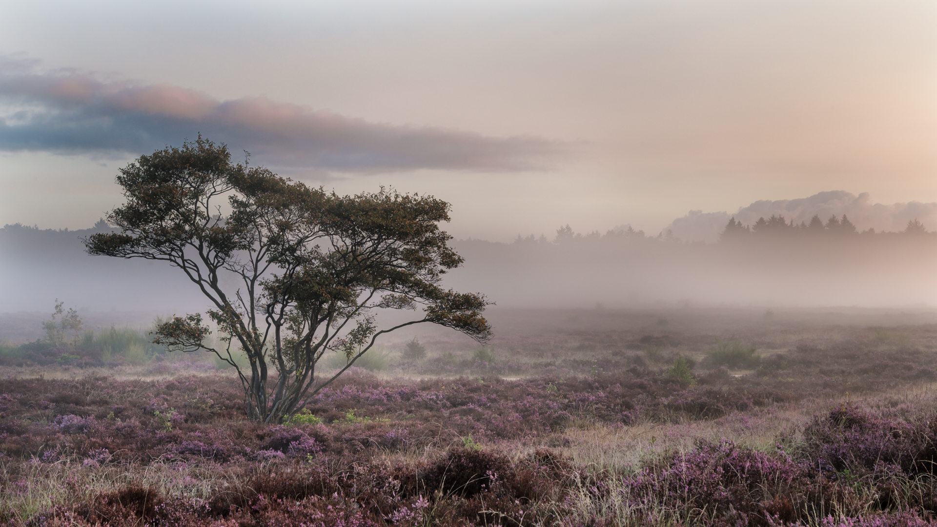 De fotodag met DDN was een zonovergoten dag met veel paars, belicht door een felle zon die de kleuren goed deed uitkomen. Welke kant je ook opkeek, overal was het mooi en je moest keuzes maken wat je wilde fotograferen. Ik heb de dag met een leuk gezelschap doorgebracht, maar ik was er (stiekem) ook al bij zonsopkomst. De heide was belegd met een mooie laag mist. De kleuren nog niet zo fel, maar met slechts een enkele andere fotograaf in het gebied, was het heerlijk genieten.