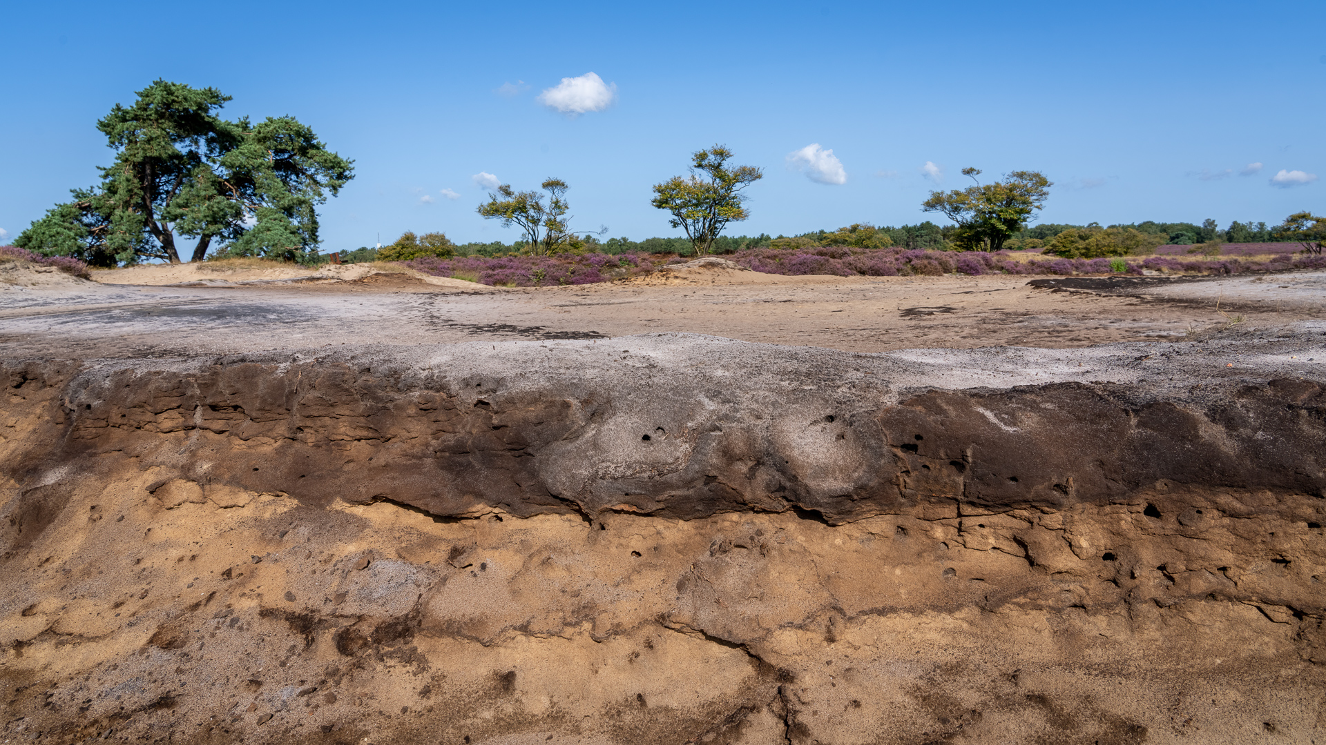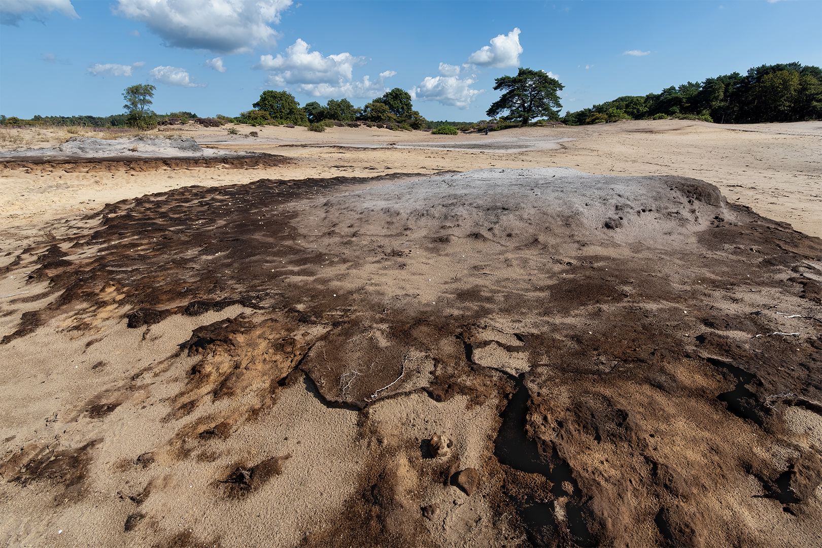 De Fotodag Zuiderheide was weer een heerlijke en geslaagde dag! Het harde zonlicht en de felblauwe lucht waren voor de foto's natuurlijk wat minder, maar de paar witte wolkjes die aan het zwerk verschenen maakten het nog een beetje goed. De zandverstuiving vind ik keer op keer een leuke speelplaats, iedere keer is het weer anders want wind en water verplaatsen het zand, waardoor hoogteverschillen ontstaan en diverse zandlagen en kleuren aan het oppervlak verschijnen of verdwijnen. Ik ben hier dicht op zo'n rand gekropen, waardoor het hoogteverschil veel groter lijkt dan het in werkelijkheid is. Lekker spelen in de zandbak ;-)