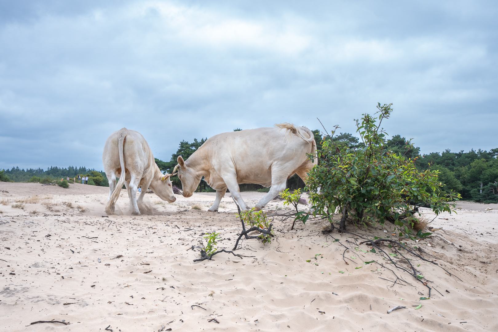 Ik was helemaal verdiept in het fotograferen toen Brigitte riep 'Pas op Loes, daar komen de dames aan!' Welke dames, vroeg ik me af? Maar toen ik me oprichtte zag ik vanuit de bosrand de Charolais koeien, die het gebied begrazen, op me af komen. Eerst een veilige plek gezocht en toen toch ook maar een foto gemaakt van deze bijna witte kolossen.