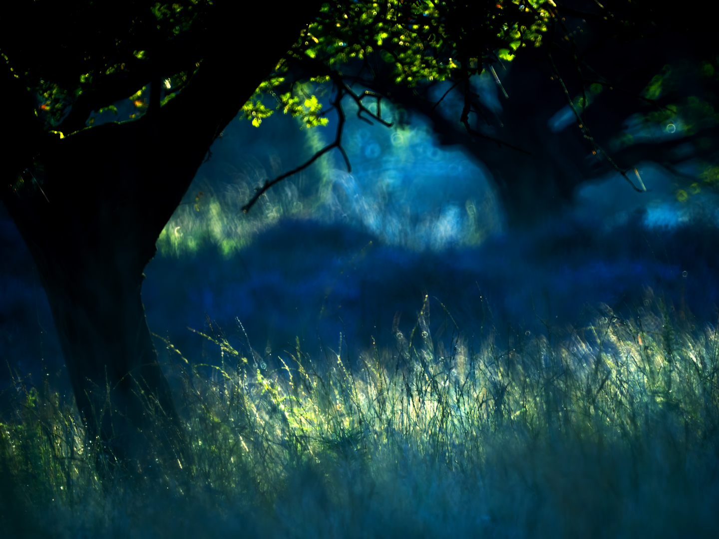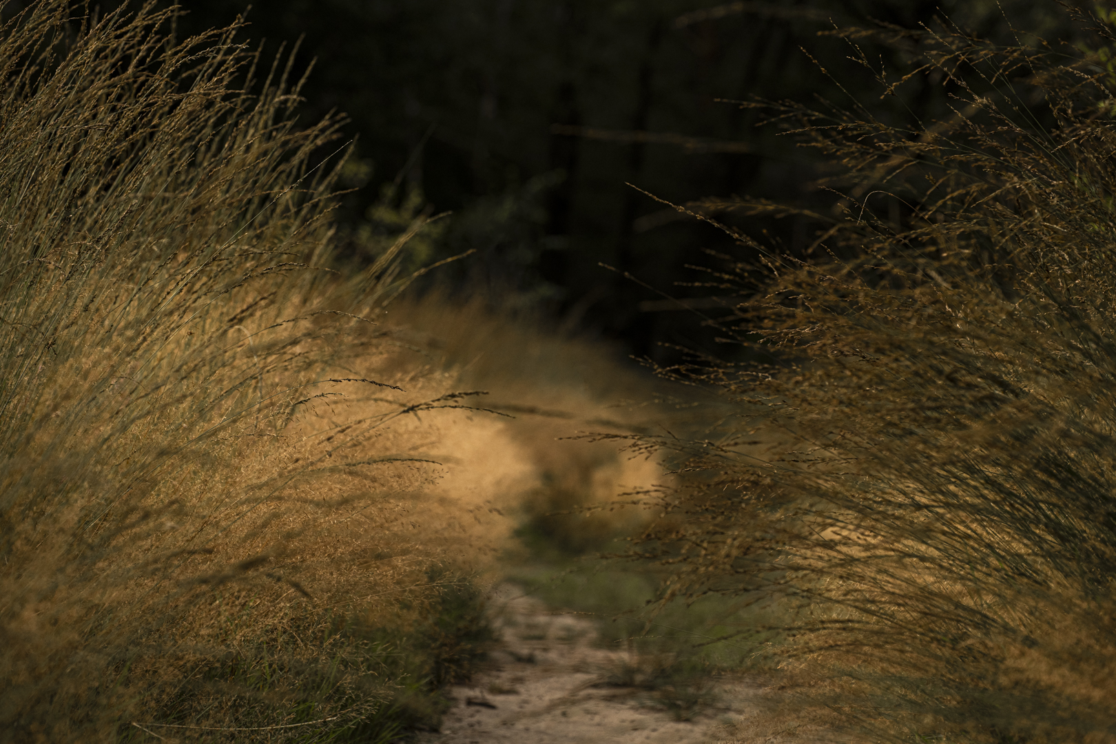 Een smal zandpad waar grassen overhangen. Flink onderbelicht om een bepaalde sfeer te creëren.