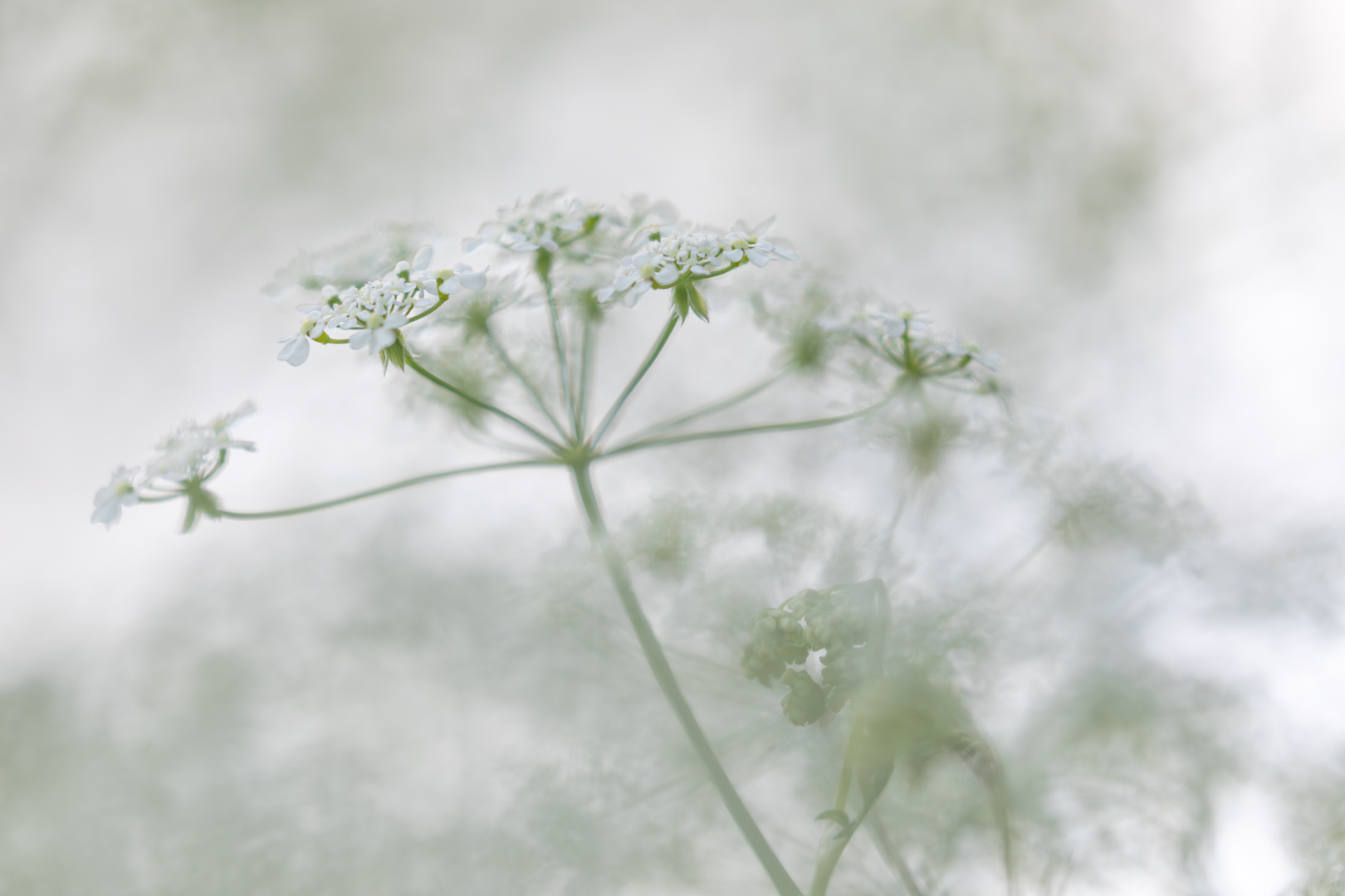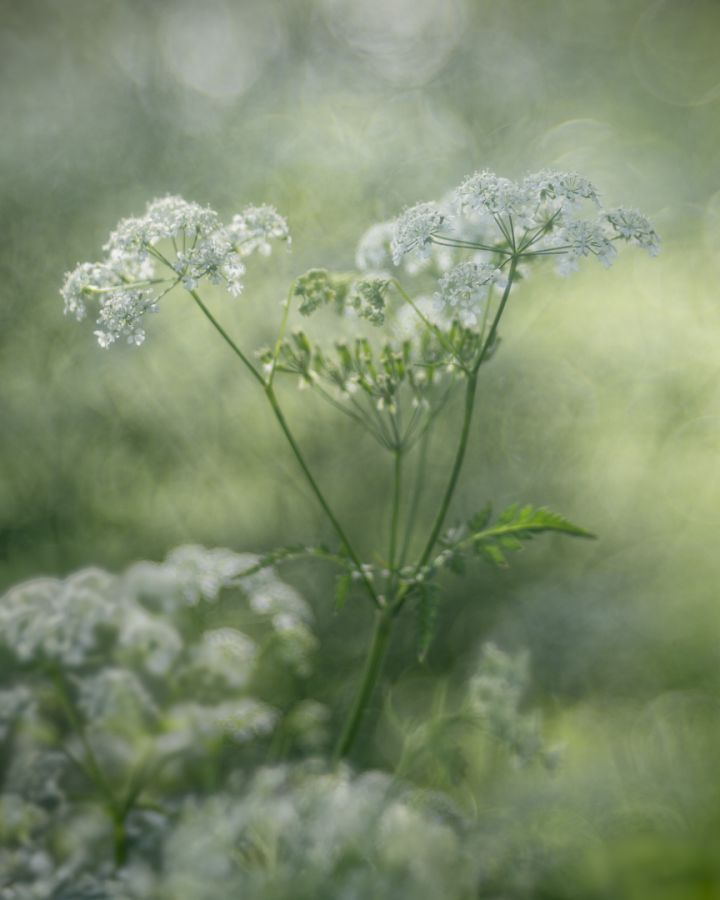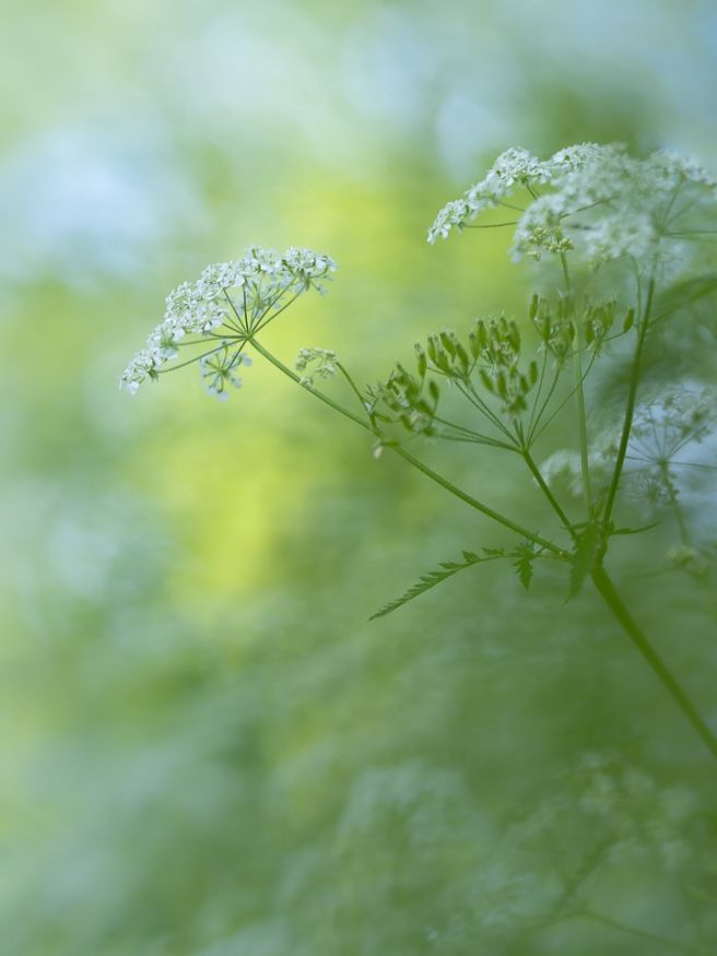 Bij de start van de workshop 50 tinten groen kwamen we onmiddellijk terecht op een stukje dat rijkelijk bezaaid was met dit prachtig fluitenkruid. Het was even zoeken vooraleer ik de sfeer vond die me kon bekoren. Deze achtergrondkleuren en de bokeh die ontstond door de lichtinval tussen de blaadjes door vond ik wel mooi.