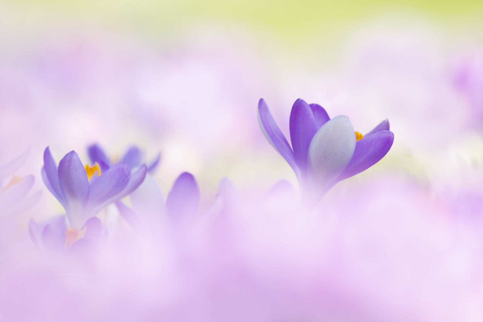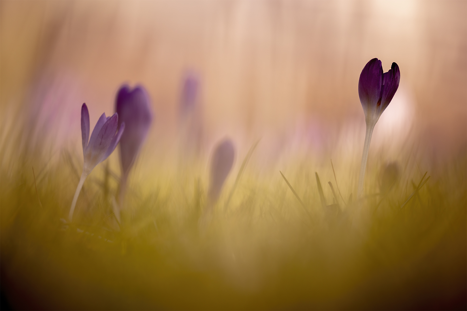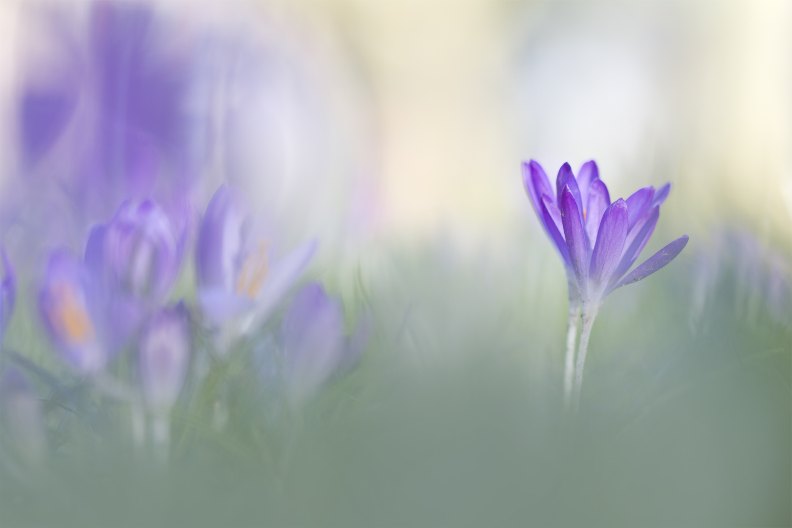 Canon 100 mm macro objectief met volle opening (f/2.8). Krokussen in de schaduw geplaatst met een parapluutje, terwijl de zon op de achtergrond schijnt. Door gebruik te maken van Exposure to the right (ETTR) techniek kan een dromerig effect ontstaan. (Bron: zoomacademy.nl)