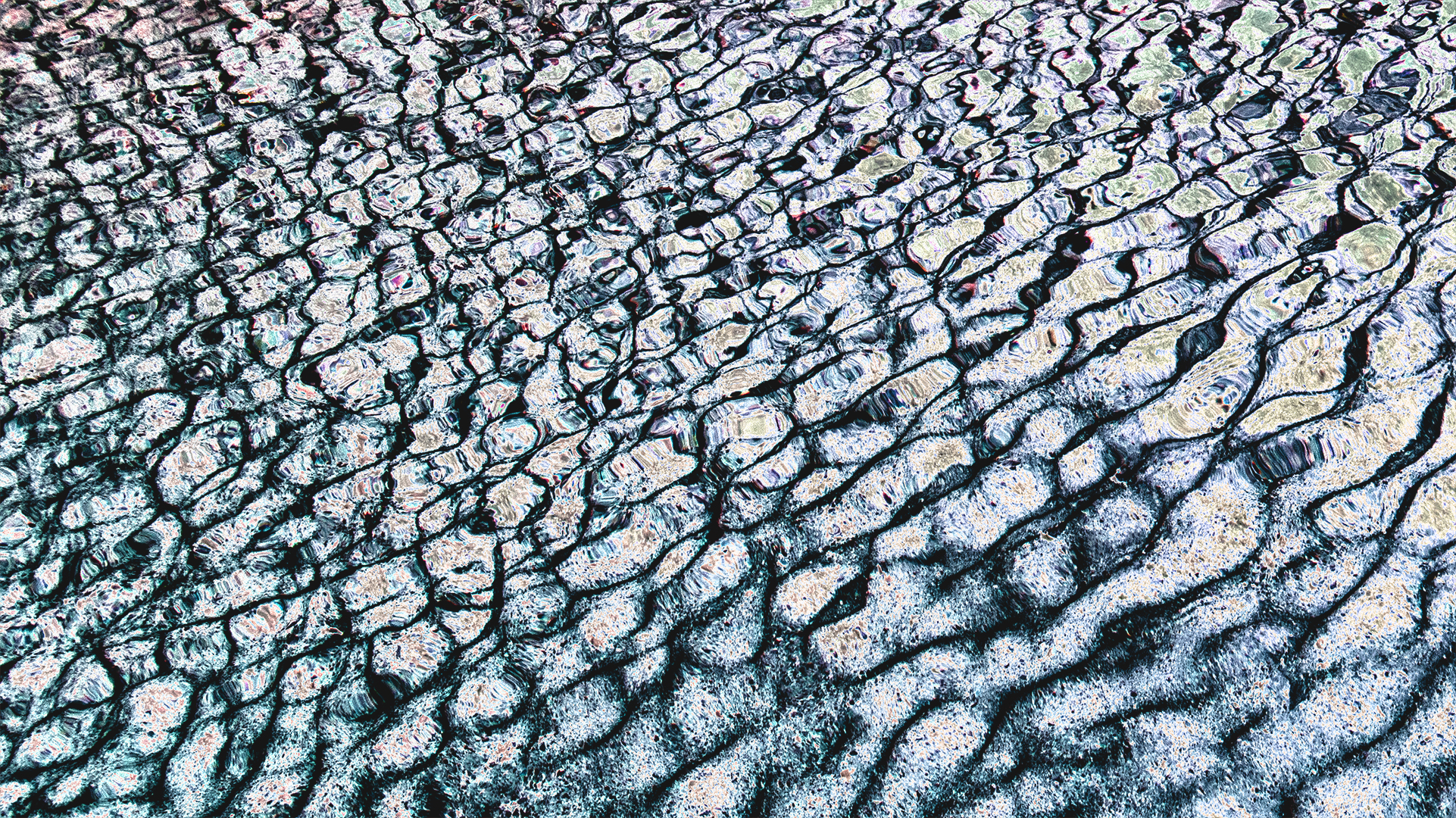 Reflecties van licht onderwater in combinatie met zandstructuren, het beeld is in de nabewerking gesolariseerd (bron: Wikipedia). Er is gekozen voor een snellere sluitertijd om het beeld te “bevriezen”