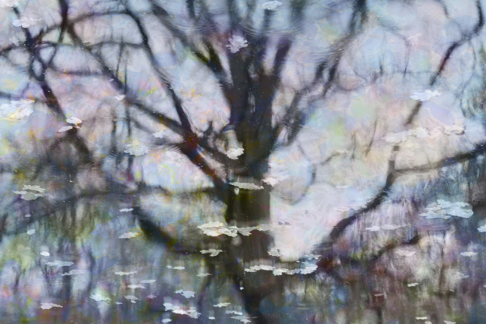 Spiegeling van een kale boom in de sloot met bewegend water in combinatie met een bloesem foto. In de nabewerking zijn de kleuren gefinetuned
