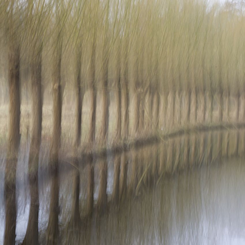 Spiegeling van uitgelopen knotwilgen in een sloot. Camera verticaal bewogen tijdens de opname met een belichtingstijd van ¼ seconde