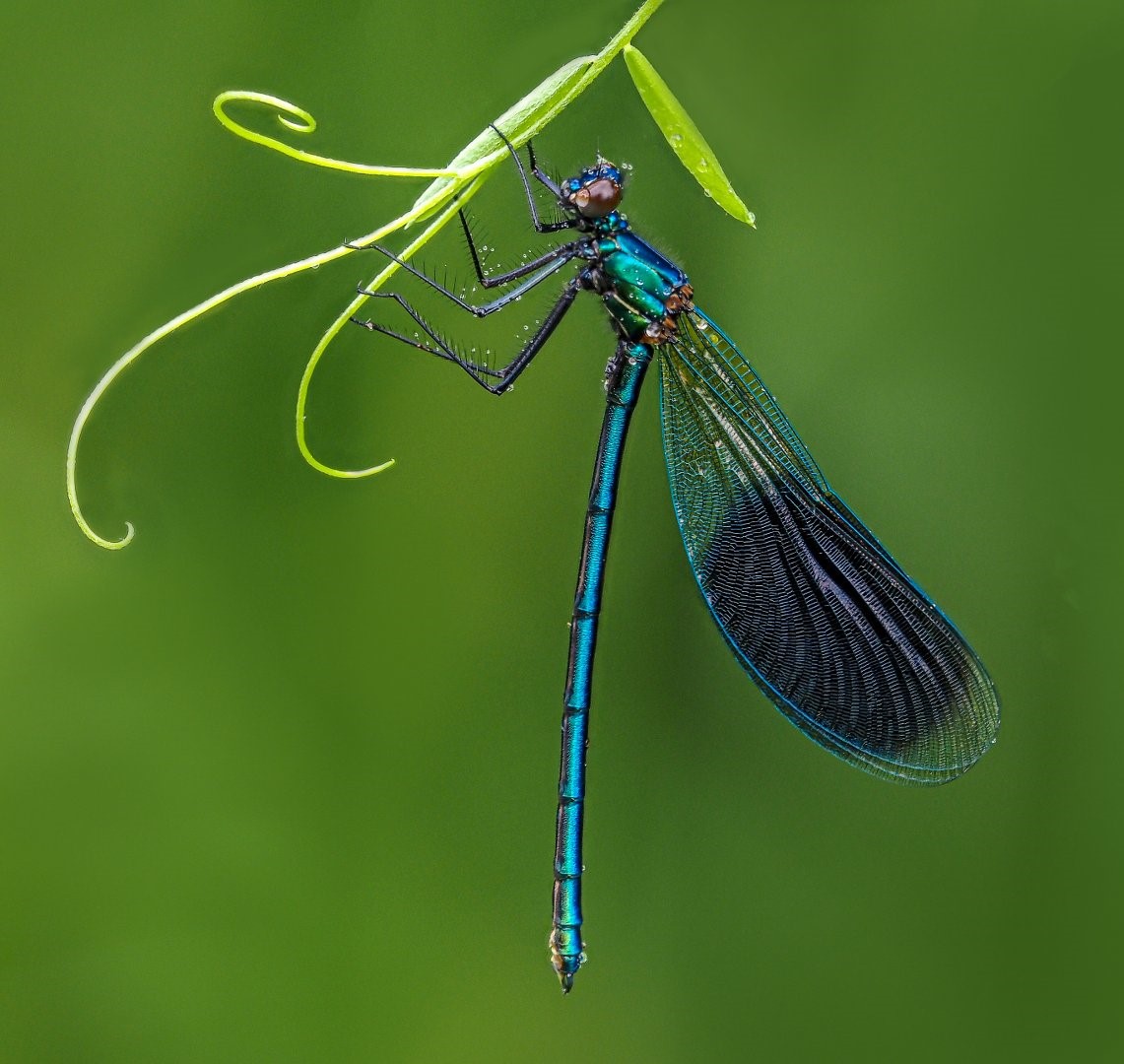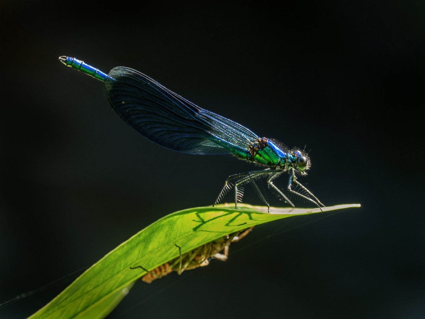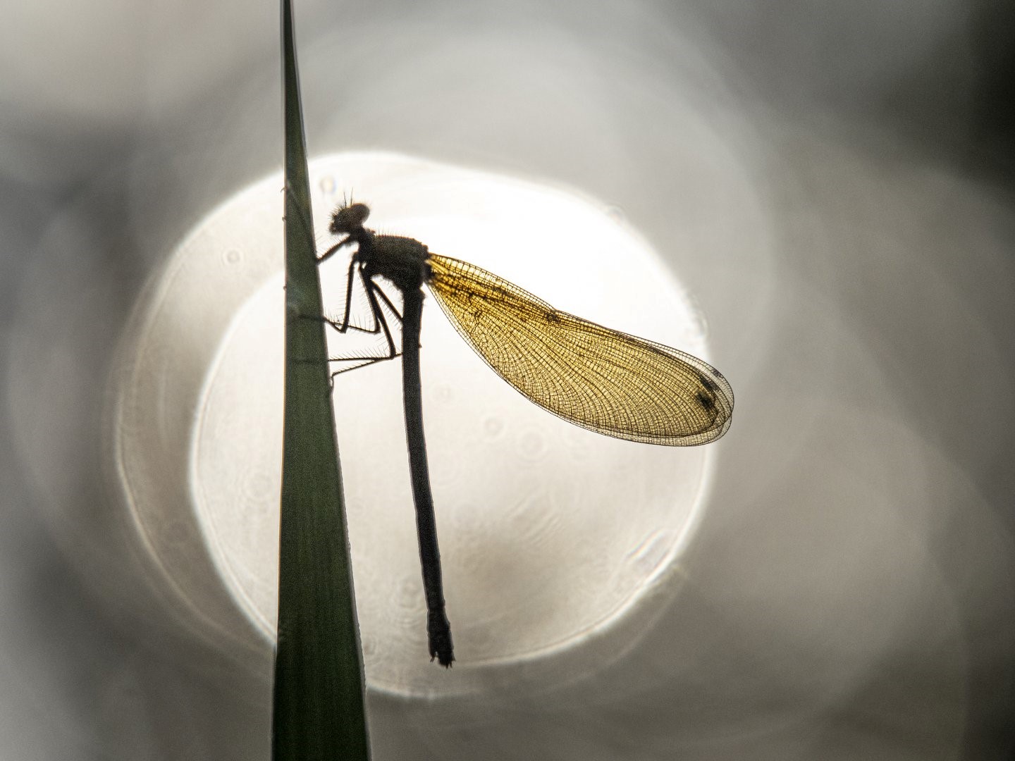 Bij deze foto heb ik het juffertje van achteren belicht met een felle ledlamp om een mooi tegenlicht te krijgen. Opvallend is dat de vleugels hier blauw kleuren