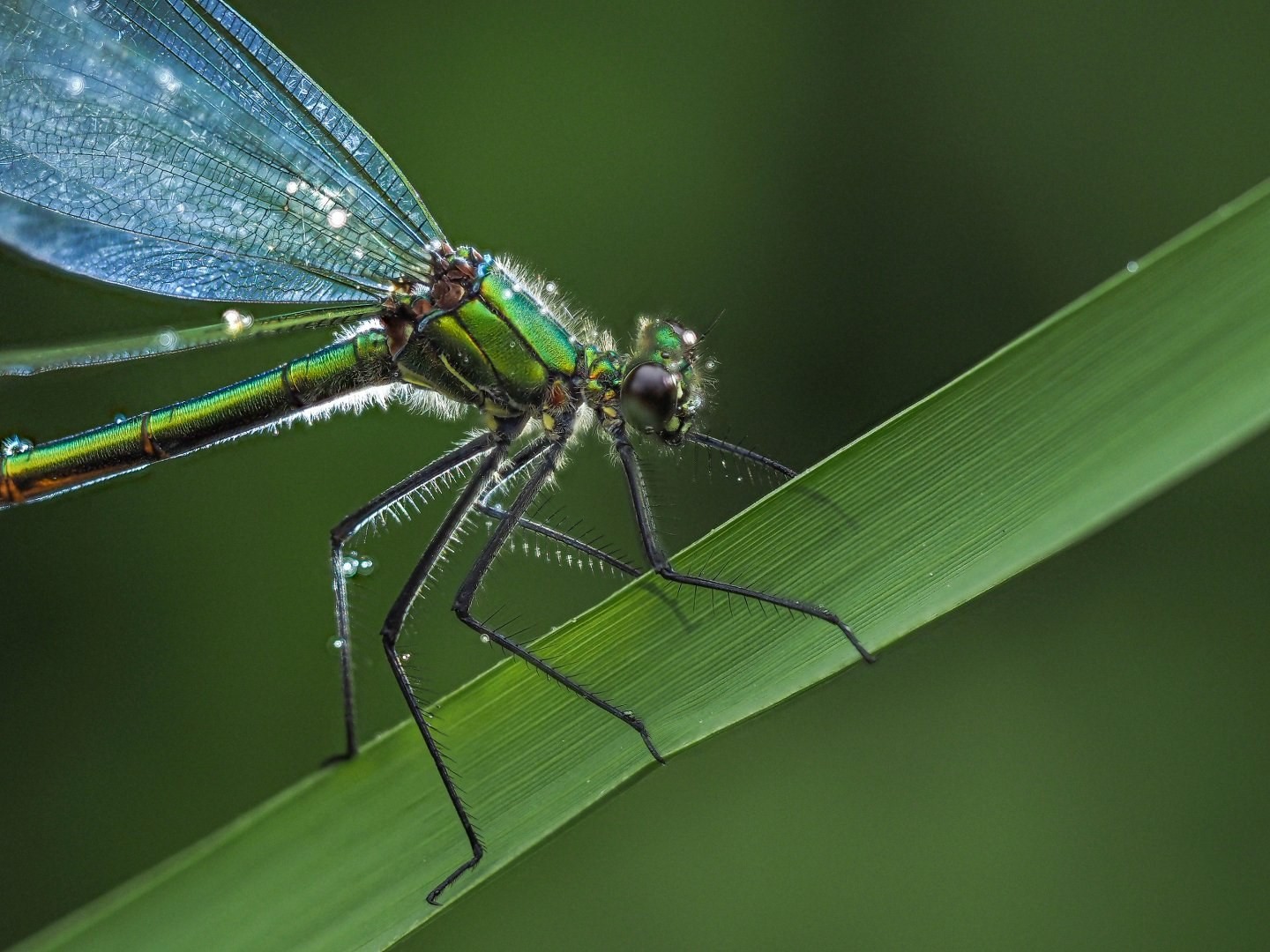 Bij het fotograferen van weidebeekjuffers heb ik diverse technieken gebruikt. Met en zonder focusstack. Met natuurlijk licht en soms met een kunstlichtbron. In de vroege ochtend is het nog koel en dan zijn de juffers nog rustig en bewegen ze nauwelijks. Je kunt ze dan voorzichtig op een ander blad of takje plaatsen door het blad waar ze op zitten heel voorzichtig af te knippen en de juffer over te laten stappen op de gewenste ondergrond zonder ze aan te raken. Als je daarna juffer met nieuwe ondergrond vastzet met een klem op een stok bijvoorbeeld dan kun je de stok verplaatsen, in de grond vastzetten en zo kun je een mooie achtergrond kiezen. Soms zijn ze ook mooi bedekt met dauwdruppels.